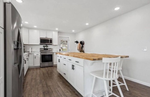 Enjoy a lake vacation in this freshly remodeled 4 bed, 3 bath house. It features 2 en suites and 2 bunk rooms - perfect for multiple or large families traveling together. The house is located right on the lake with your own private beach. The dock is in the water from Memorial Day to Labor Day each year. The kitchen has a huge island with seating for 6, a dining table with seating for 4, and an outdoor table with seating for 6. We also have comfortable outdoor furniture and a solo stove fire pit for campfires and s'mores! The kitchen has a crock pot, waffle iron, blender, and all of the utensils you need to cook and grill.