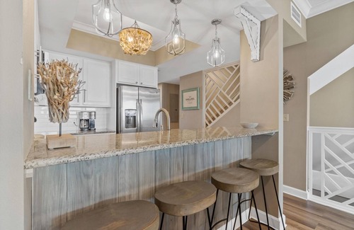 The top floor features an over sized master bedroom with a wall of windows overlooking the gulf, a private balcony, master bath with full shower, jetted whirlpool tub and double vanities. The laundry (stacked washer and dryer) area is on this floor along with a bedroom with two twin beds and a full bath.