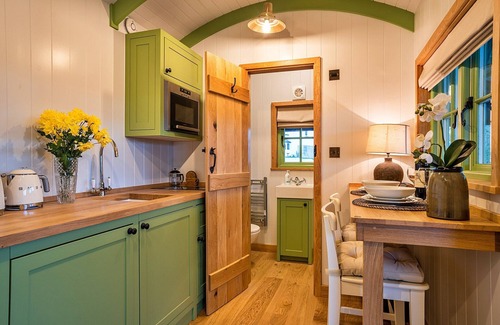 The Shepherd's Hut at Northcombe Farm offers a perfect glamping retreat, combining the charm of traditional design with modern amenities. Located on a picturesque Devonshire farm, this hut provides a cozy and rustic escape, while offering comforts such as central heating, a walk-in shower, and a kitchenette. The hut is ideally situated by a serene lake with stunning views across the countryside, making it a peaceful hideaway for those looking to relax or explore the natural surroundings. Guests will enjoy a well-designed open-plan space, including a double bed, a kitchenette with a dining bar, and a bathroom equipped with a walk-in shower and flushing WC. The sheltered outdoor seating area under the barn roof provides an ideal spot to unwind with a hot drink or glass of wine, even on rainy days. The farm also offers opportunities for fishing in the lake and equestrian activities, while Dartmoor National Park, perfect for hiking and cycling, is just a short drive away. This pet-friendly retreat offers all the conveniences needed for a relaxing stay, including an electric car charging point. It’s a wonderful choice for those looking for an intimate and comfortable glamping experience in the heart of nature.