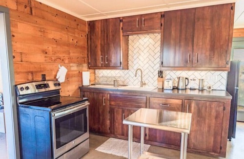 An ideal retreat, this newly renovated modern two-bedroom cabin retains its original 1954 charm, with midcentury floor-to-ceiling windows and original tongue and groove paneling, as well as an antique wood-burning fireplace. All this is accompanied by contemporary luxuries like central heat/AC and a full kitchen with handmade cabinets and brand new appliances.