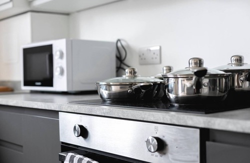 The fully equipped kitchen, which includes a fridge freezer, washing machine, microwave, toaster, induction cooker, hob, oven, kettle, and coffee/tea facilities, encourages you to partake in sophisticated dining experiences.