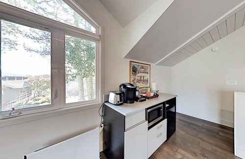 Head to the main house on the grounds, where there's a shared pool and another hot tub. Situated on expansive grounds with a separate main home, this cottage is laid with hardwood floors. A spacious, open-concept living area features a sofa and two leather chairs, a 40" TV (equipped with Apple TV and Blu-Ray), and a Sonos sound system. Kick back by the gas fireplace. A full-efficiency kitchen has everything you need to prepare meals. Grill steaks and enjoy them at the indoor dining table for everyone. After a day of wine tastings at nearby vineyards, sink into the queen bed. Upstairs, a loft with a separate entry sleeps two in a queen bed. Refresh in a private bathroom with a walk-in shower and skylight. The loft boasts comfortable seating: a love seat and an oversized chair for lounging in front of the TV or reading a book. A small kitchenette area offers a microwave, Nespresso coffee maker, and a mini-fridge. Unwind on the back deck, where you can take in the vineyard and mountain views from a bubbling private hot tub.