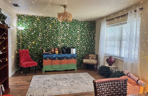Nature lovers, welcome home. This charming 1970s 4BR, 2BA Soul-Cation Sanctuary sits on a peaceful, private 1-acre lot with a warm small-town feel. Surrounded by trees and birdsong, the rustic-boho interior invites deep rest, while outdoor nooks offer space to lounge, grill, stargaze, or meditate. Perfect for wellness retreats, quiet escapes, or family resets. 3 bedrooms + cozy bunk room. Also listed on other platforms—inquire for availability!