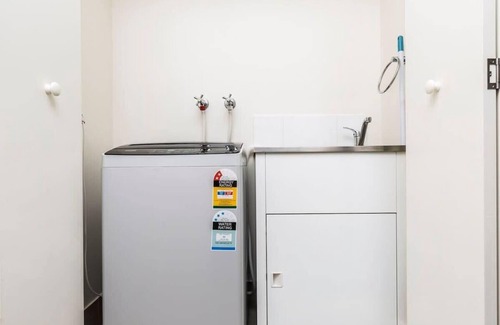 There are two bedrooms, both of which have queen-sized beds. In the main bedroom, there are built in wardrobes with lots of space for longer stays. The bathroom features a large, glass-framed shower recess. There’s also a European-style laundry with a washing machine and dryer.