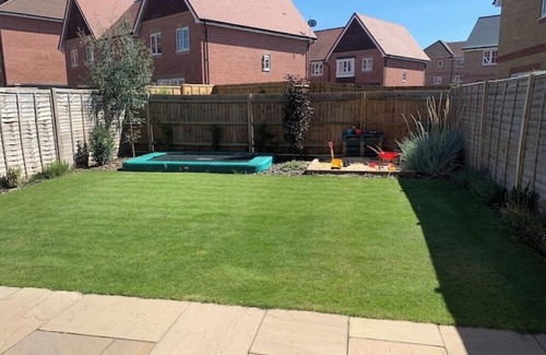 A spacious, clean, fully furnished, modern house with four large bedrooms and three bathrooms. The garden has a trampoline and a sandpit for the kids and there’s a well equipped gym in the garage for the adults. It’s a 5 minute walk to the train station and a 10 minute walk into town. There is off street parking and the house is situated on a no-through road.
