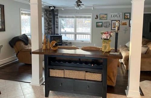 In the summer this house has great outside space with a large grassy lawn, firepit with six adirondack chairs, and a wrap around deck with patio table and chairs seating for 4 and propane grill. The Living room, dining room and kitchen are one open space, there is seating for 4 at the counter and 6 at the table. In the living room there is a woodstove and some comfy fully reclining couches. Downstairs off of the living room there are 2 connecting rooms and a half bath, the first room is an office space with a recliner couch, rocking recliner and desk with desk chair. The second room is set up as a movie room with an HD projector and 200" projection screen with an apple TV. Upstairs there are 4 bedrooms. The main bedroom has a king bed with an on suite bathroom and massage chair. There is a full bathroom with tub/shower and 2 sinks. The 2nd bedroom has a queen bed, the 3rd bedroom has a full size bed and the 4th bedroom has a queen bed with attached sink room. There are two queen size air mattresses and a chaise lounge available for additional sleeping. In the semi finished basement there is a full workout area with elliptical, free weights and weight bench. In addition the basement has a large play area with plenty of kids toys, arial silks hammocks, air hockey table, foosball table and mini pool table.