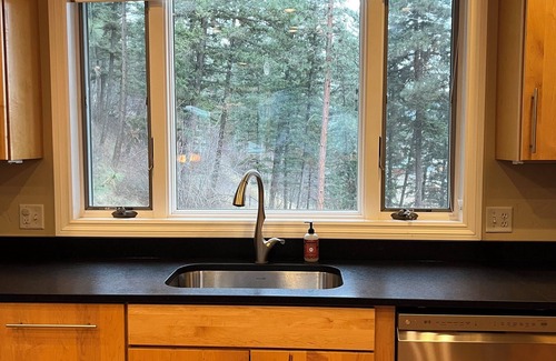 Let this mountainside lodge be your Missoula basecamp, perfect for group getaways or a quiet retreat. A spacious, well-appointed kitchen, great room, sunroom, huge outdoor patio, and 6 private bedrooms make for comfortable gatherings. The lodge is situated on 10 acres - part pasture and part forested, in the outskirts of Missoula. Whether relaxing inside or out, you'll enjoy the 360 views of beautiful ponderosa pines and horse pastures. You can explore the property to your heart's desire, check out the Clark Fork River access a mile away, or be in town or the airport in less than 15 minutes. Upon arrival, you'll find easy access up the driveway and parking for half a dozen cars. Through the front door is a beautiful staircase and spacious entryway. Up the stairs, you're met with a large common space and big windows of the forested yard. The kitchen is a chef's dream, with a double bar, a 5-burner gas range, and a bonus oven. Dishes are easy with a speedy dishwasher, and there's a separate wet bar and 4 bar stools for entertaining. A half bath is directly off the kitchen for convenience. A gorgeous sunroom is also directly off the kitchen, featuring a breakfast table, seating area, and calming views of the countryside. Back inside, the Great Room features a large 8-seat dining table, big sectional couch around a cozy fireplace, and a TV with ROKU and wifi. Adjacent to the Great Room is a lovely library and game room. Down the hall are Bedrooms 1, (King) 2 (Queen), and 3 (Queen), and Bathroom #1 with a tub/shower combo and double sink. Heading down the back staircase, you'll find a cozy TV room equipped with seating and children's toys. Down here you'll also find the laundry room with washer, dryer, and utility sink, a private guest suite area with Bedroom #4 (Q), Bathroom #3 with a shower, a bonus room, and separate porch entrance. In the other wing of the basement, there are two adjacent Bedrooms 5 & 6 (each with queen beds), and large full Bathroom #4 with a tub/shower combo. Heading back toward the front entrance, you'll find a large tack room for coats, shoes, and storage. There's a door to the back patio - a memorable gathering space perfect for dining, grilling, and letting the kids and pets run around while enjoying the views. The home is pet friendly with fenced yards, and family friendly with games and toys. We also have a pack and play available upon request, and there are 2 baby gates available for safety on the stairs. There is an accessible entrance through the backyard - just ask your hosts for instructions if any guests have trouble with stairs.