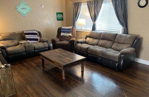 Pet friendly ranch house close to casinos, downtown attractions, nearby beaches and the dunes. World famous Bandon Dunes Golf Resort is just 20 minutes away. Our living room is spacious with recliners for five people. The back deck is secluded for a relaxing evening. Our single story floor plan and walk-in shower allow for ease of mobility. The hard wood floors are great for kids and pets. We offer a fenced yard and kids toys for entertainment. A charcoal grill is available for your use. All energy for the house comes from renewable resources.