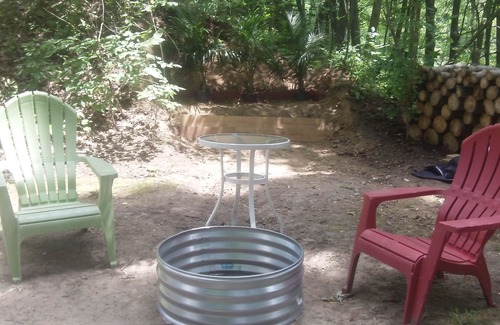 This 27 foot RV is in a secluded space with a large meditation garden on one side and stairs down to the lake on the other.