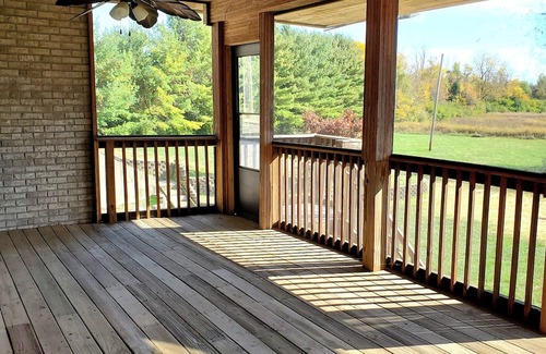 Welcome to our bright, private, spacious home! The perfect place for family & friends to relax, be entertained & connect. On over 3.5 private acres there's something for everyone: Let the kids play pool or ping-pong in the basement while you enjoy the screened porch or vaulted living room on the 1st floor. Throw a friends movie night in our bean bag filled movie theater room or cook an epic dinner in our fully stocked kitchen. With 3 floors, 7 bedrooms & 6.5 bathrooms there's space for everyone! ........................................................................................................................................................................................................ Tucked away at the end of the road, our 3-story home has 7 fully furnished bedrooms; one primary bedroom on the first floor (with a king bed), 2 primary bedrooms on the second floor (both with king beds), 4 secondary bedrooms on the second floor (1 king bed, 3 queens) and one unfurnished bedroom in the basement. Each primary bedroom has an ensuite bathroom with 2 sinks, a walk-in shower, jacuzzi and water closet. While the secondary bedrooms share Jack-and-Jill bathrooms featuring 2 sinks with a separate shower/tub combo and toilet. ........................................................................................................................................................................................................... The spacious kitchen, with ample counter space, opens up into the breakfast/casual dining area surrounded by large, panoramic windows, the perfect place to catch a deer or two running through the yard. The ground floor also boasts a large foyer, formal dining room, an open living room with attached bar, a large office, and one of the primary bedrooms. Our basement is the perfect place to hang out with a ping-pong table, pool table, second living room, a movie theater room with 8 large bean bags and enough space to have your own little dance party. This custom-built house was created by our grandfather so we hope you feel right at home and treat it respectfully as your own!