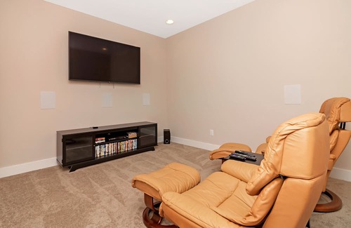 Downstairs, you will find an additional living area with a sectional couch and flat screen TV and DVD. A second deck with a firepit and sectional seating is accessible from this level with additional outdoor entertainment space. One of the highlights of this floor is its theater room, complete with a surround sound, 75-inch television, and two marvelously comfortable Swedish reclining chairs. There are three bedrooms on this floor. The first bedroom is another queen master with ensuite, while the remaining two bedrooms are both equipped with queen beds and share a bathroom. All the bedrooms have large closets.
