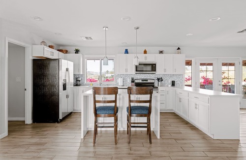 Open-Concept Design: A spacious, light-filled floor plan creates a seamless flow between indoors and the great outdoors. With 2,400 sq ft of open concept living, the kitchen, two dining areas, and living area are truly open to each other. Sit down together to dine and use the high table for board/card games while watching a game or movie on the 72" TV with Stereo sound. While open concept promotes "togetherness", everyone needs their private space from time to time. This home is perfect for a small family or to include the Aunts, Uncles, and Grands! With open concept living that leads to multiple outdoor seating areas, each of the three bedrooms (with TVs) offer their own escapes from the crowd.