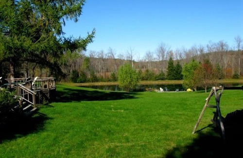 Huge, sprawling, 6,000 sq ft country estate situated on 10 acres of land which include both a 1/2 acre spring-fed swimming pond with a sand beach and tennis court (hard court). The property features a huge landscaped lawn, massive deck overlooking the lawn, pond and tennis court, a vegetable garden, a fireplace room, eat in stainless steel renovated kitchen, breakfast room, 'great room' surrounded by windows overlooking the property, a greenhouse room, basement play area, large TV room (featuring 42'' plasma TV and numerous couches) and a massive bedroom that has a king bed as well as two single beds. The house itself is an homage to rustic country living, with wood beamed ceilings, wood and stone accents throughout, and furnished giving it a soft, cozy feel. This house is PERFECT for one, two, or three families looking to retreat for a week. See bottom of page for info regarding furnishings / activities.