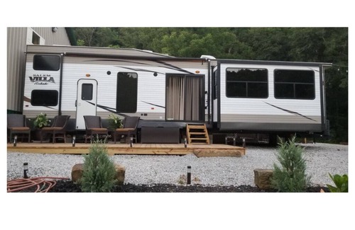 The Birds Nest Villa is your perfect park model villa choice if you want a spacious living room and huge kitchen during your stay at Pine Creek Villas. Bed sheets, towels, and basic cook-wear are included in all villa stays. This amazing vacation getaway is loaded with perks that you wont find at your traditional Hocking Hills cabin. The Birds Nest Vacation Villa comes with a Full kitchen with an island sink, a Full bathroom with a sliding door shower, an Electric Fireplace, 3 Flat Screen Tvs, Surround Sound, a 4 Person Dining Table, a Leather Recliner, a Leather Sofa, Privacy Blinds on all windows, Air conditioning/ Heat, a full sized Pull out Couch, Sliding Glass Doors that open onto a relaxing patio with outside disco lighting, Access to our Pine Creek Beach, and Exclusive Access to the Lounge Deck : Perfect for patries and get togethers!