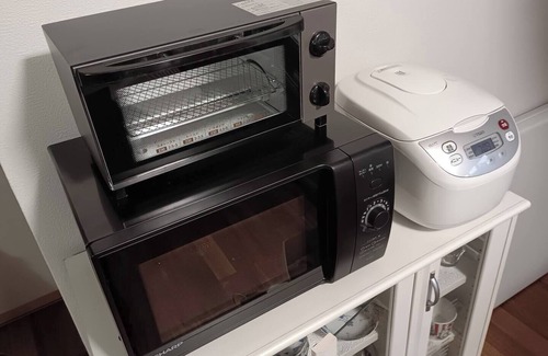 Living & kitchen: fridge, microwave, rice cooker, kettle, cooking utensils, dishes