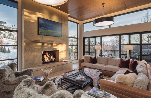 There are two spacious living areas on this main level, one on each side of the dining area. To the right is a fully equipped professional-grade kitchen with Wolf appliances, sleek white marble countertops, a pantry, a wine fridge and two dishwashers. The large island has bar seating for six; and there’s a breakfast table that seats 8 guests. The kitchen is open toward the main living room with a gas fireplace, big screen TV, and another wall of windows that look out at gorgeous views of the ski slopes and valley beyond.