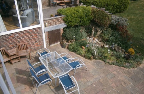 There is a large raised patio from the loung, a patio from the dining room and a large patio at the end of the garden all with great sea views.