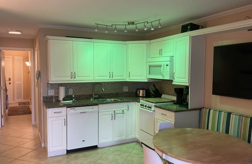 The condo is remodeled with a unique open design that is spacious and sleeps six. It is nicely decorated with a lighthouse and beach theme. It has granite countertops with spacious cabinets and LED lighting. Kitchen is equipped with a new refrigerator with ice maker, stove, microwave, dishwasher, coffee makers, instant pot pressure cooker, tea kettle, waffle maker, blender/mixer, assorted pots and pans, plates, cups, utensils. The round table is ideal for four to eat and play games but can be expanded into an oval table for six to eat and play comfortably. Bench seat provides seating for two to three and storage for bedding for queen sleeper sofa. It has beautiful tile floors throughout for easy maintenance and wood floor in bedroom for a softer tone and some rugs.