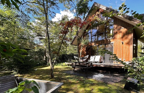 2022 new villa It is located in the traditional core area of Karuizawa near Hoshino hot spring with a Japanesestyle cottage and Nordic antique furniture All the amenities kitchenware and tableware are made by Japanese designers clean and highquality Enjoy a private and silent stay in Karuizawa with your family and friends