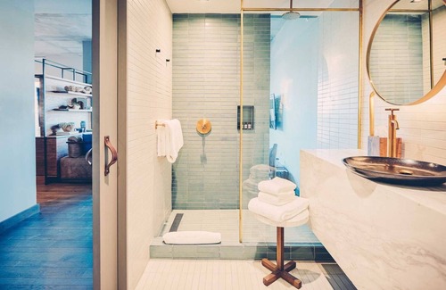 Nestled above Austin’s trendiest strip, the hotel offers pool views, local eats, and creative charm. This premier suite has a deep-soaking tub, walk-in shower, and balcony.