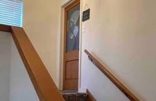 The apartment is located on the second floor of an office area secured by a heavy ornate metal and glass door. Once inside there are stairs going up to the suite that are wide, carpeted and well-lit.