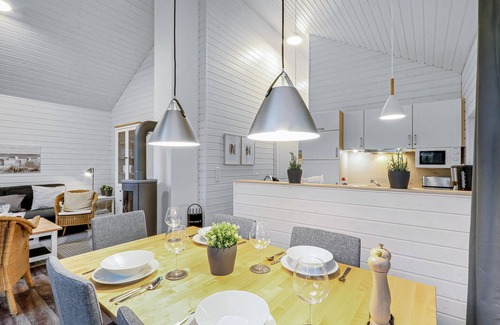 The modern wooden house Waldliebe is located on the edge of the holiday park and impresses with its Scandinavian style. There is plenty of space for 4 adults and 2 children. Thanks to the ridge-high open ceiling, you can enjoy a pleasant feeling of space and light-flooded rooms. The maritime furnishings in light colours contribute to the cosy atmosphere.