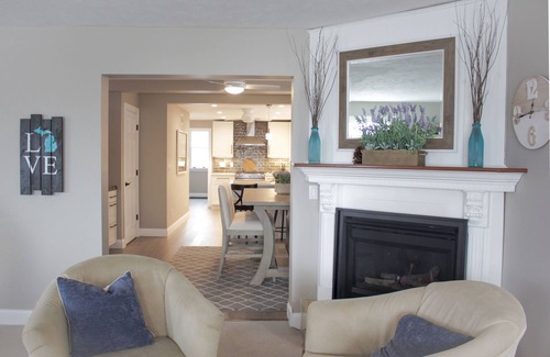 Beautifully updated kitchen includes all dishes, glasses, silverware, pots and pans, refrigerator, gas stove, microwave, coffee maker (Keurig & drip), toaster, blender.