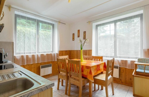 The "Malovidy" vacation property offers a beautiful view of the surrounding valley and countryside from its terraces. It provides internet access through a free WiFi connection. Please note that this is a non-smoking property, and it is suitable for families with a smoke alarm installed. The house is divided into two separate parts, each with its own entrance and fully equipped kitchen. The property features electric and wood heating options, a 40-square-meter terrace with outdoor furniture, and easy access to the swimming pool area.