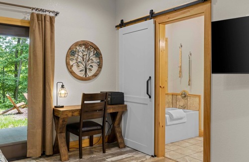 Nanta-Haven's one-level cabin boasts a charming rustic design and is equipped with a whole-house generator, ensuring uninterrupted comfort no matter the weather. The open floor plan features a spacious living area with a 65” HD Smart TV, a gas fireplace, and plenty of comfortable seating. The fully-equipped kitchen comes with stainless steel appliances and granite countertops, seamlessly flowing into a dining area that seats up to 8 guests. Whether you're cooking a meal or enjoying a cozy evening in, you'll find everything you need right at your fingertips.