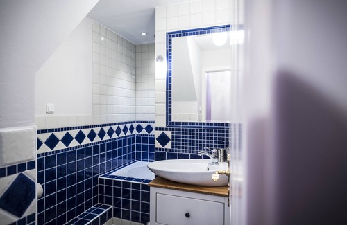 The nostalgic blue and white bathroom has a bathtub with rain shower, a vanity with two drawers, a large mirror with two additional lights and a towel radiator. A hair dryer with diffuser and a bath towel and towel per person are provided.