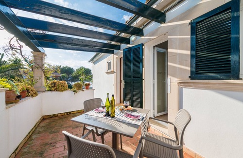 Great seafront apartment at only two steps from the sandy beach in one of the quietest residential areas of Alcúdia, overlooking the bay of Pollença and Cap Formentor.The spectacular sunset views from the large terrace and dining room will surprise you with romantic afternoons. The apartment is located on the first floor of a two storey villa. The ground floor belongs to another owner. The house counts with its' compulsory vacation rental license. This place is ideal for tranquility, long walks along the coast and enjoying the sea without crowds.The modernly furnished villa counts with 3 luminous double bedrooms (one with two single beds and en-suite shower room and two with a double bed) and another bathroom with shower for general use. The large independent kitchen is well equipped with a ceramic hob, electric oven, dishwasher, microwave, fridge, coffee maker and any other utensils you might need to prepare an excellent dinner during your stay. The comfortable living- and dining room with sea- and mountain view is fitted with a sofa and two big armchairs to enjoy a good movie or relax during the warmest hours of the day. From the living- and dining room you access the large, west-facing terrace to enjoy the sunset. On the other side, with exit from the kitchen, there is another terrace, to enjoy breakfast in the Mediterranean sun. The apartment is equipped with wifi and air conditioning (hot and cold). The fireplace is merely decorative (can not be used). For a baby up to 2 years old we can prepare a cot and a highchair without additional cost (on previous request).The apartment is located in the north of the island, on the coast of the bay of Pollença. It is perfect for water sports such as canoeing, fishing or diving and discover the reefs of the bay. The nearest supermarkets, restaurants and shops are in Alcúdia (15 minutes on foot), one of the most historic and beautiful cities of the north coast of Mallorca. You can walk along the coast to Es Barcarès, 5 minutes from the apartment, a residential coast area with small beaches and coves, ideal for a walk. It is also very close to the Mal Pas, where the beautiful natural sandy coves of Sant Joan and Sant Pere are perfect for the whole family. It is 20 minutes walk from the coast of Bonaire, where you can explore small virgin coves.The house is perfect for a quiet holiday, whether you travel as a couple or family away from tourist crowds and noise. Delight yourself by the sound of the waves and the wonderful views of the Mediterranean Sea by choosing Sunset Villa Nixe for your holiday: you will not be disappointed!- Tourist tax not included.From May to October, it costs €2.20 per person, from 16 years and over, per night.From November to April, it costs €0.55 per person, from 16 years and over, per night.