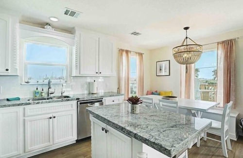 From the gleaming gourmet-ready kitchen to the marble shower, this rental presents a higher-end Gulf Coast retreat that’s less than a ten-minute stroll to the sand and surf. (Check out our images to get a better sense of the distance!)