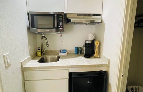 - As you walk in, you will find a desk and working space on your left hand side with a lamp and a mirror, to your right you will find the fully loaded kitchenette with hot plate located under the sink. Also, under the sink, you will find a dish rack for clean dishes, paper, towels, and trash bags. There will be a fresh sponge and dish soap and a dish towel for your use as well. All of the dishes and cooking ware will be above the sink area in the cupboards and a Keurig coffee maker will be on the counter.