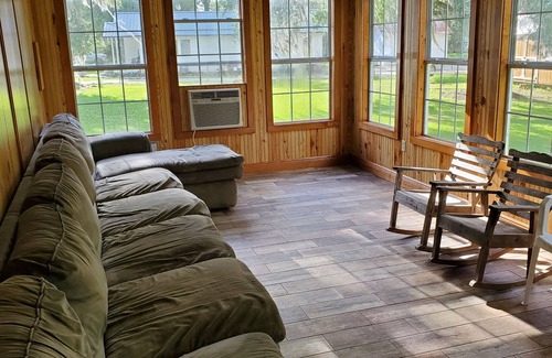 It also has a sunroom with a large sofa and can accommodate 2 queen size air mattresses comfortably.