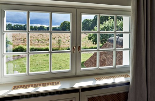 Up the wide wooden staircase, which is already a visual highlight in itself, you’ll reach the upper floor. Here, there are three bright bedrooms, so everyone can find their own retreat. The master bedroom has a walk-in wardrobe and a wide view of the garden and fields. In bedroom two, you’ll find a cozy double bed, and in bedroom three, a special surprise: A single bed set into an alcove, evoking the charm of Astrid Lindgren's stories – simply cozy!