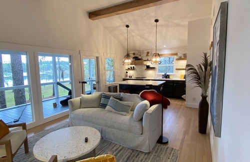 A part of the Eden at Gracefield event venue, welcome to The Ashepoo House, a charming 3 bedroom 3 bath home. ***PLEASE NOTE THIS IS A SPLIT LEVEL HOME WITH MASTER ON GROUND FLOOR AND ALL OTHER LIVING SPACES UPSTAIRS*** The most private of all the homes on this 515-acre Estate, it has a dock on a large lake, where geese and ducks flock every year. Take in the spectacular view while relaxing with friends and family on the elevated screened-in porch. Fish off the banks or paddle out on the lake and try for that “catch of a lifetime’… we’ve caught some bass as large as 15lbs in our lakes here at Eden! Recently renovated, this home is an absolute dream! Everything is brand new and well-appointed, with a King bed in the ground floor master suite as well as 2 chairs and large flat screen tv.