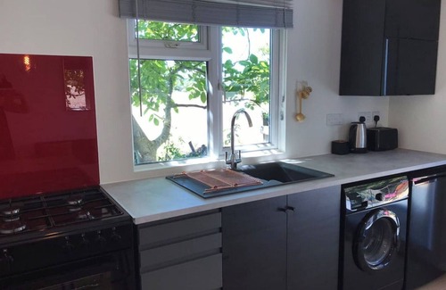 The Bay Cabin, newly renovated in 2020, is a uniquely designed 1-bedroom secluded retreat, privately tucked away in its own garden, overlooking a barley meadow. Freshwater Bay beach is minutes away, and miles of Outstanding Natural Beauty. Stylish mid-century 20th design and luxurious comfort is at the heart of cabin life. Large private outdoor space awaits, so you can lounge in a hammock, light a fire on the stove or cook al fresco. Perfect for couples seeking escape and atmosphere. Super fast WIFI. Parking on driveway.