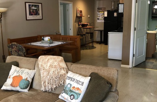 Located in downtown Warsaw, Mo. on the east end of Main St. NOTE: Bagnall Dam/ outlet shopping is an hour and a half drive from us. Please check OUR location on the map before you book! We are close to Truman Lake, the Osage arm of the Lake of the Ozarks at Drake Harbor, antique shopping, and a short walk to downtown Warsaw. Also about 30 min. Drive to the Missouri State Fair in Sedalia. Our cozy, clean and spacious cabin hides in plain site, nestled inside of a 5000 sq ft building. The living room has a TV with dish network. The kitchen has a full size stove, refrigerator and dishwasher. Two bedrooms, one with a queen and other with two twins and a trundle that adds 2 more twins. Outside we have a deck and BBQ area. Great for fisherman with a fenced in area for boat safety overnight! Also the perfect “girlfriends get-away!!! Families with pets welcome.