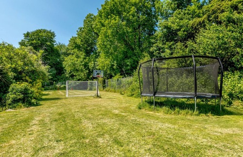 Outdoors: Private patio with BBQ and furniture, Shared use of heated swimming pool (under glass cover) from May 17th, patio area with furniture, trampoline, indoor and outdoor children's play area, large grass area and landscaped grounds