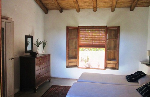 See video of cortijo on youtube https://youtu.be/tZdNZRxpeyU Extremadura is a wonderful part of Spain, pure nature but with plenty to see and do. This is a unique property full of character. The cortijo is the original farmhouse/countryhouse at Finca al-manzil. An ideal place for peaceful family holidays or a wonderfully romantic atmosphere for groups of friends. It has been beautifully renovated but retains that special Spanish country house feel. Very spacious with double height sitting room, 3 spacious bedrooms, all en-suite bathrooms. A covered porch, open terrace and a roof terrace, a special place ideal for all times of the day and for sitting under the canopy of stars at night. The kitchen is well equipped for creative cooks, dining room has huge refectory table and doors to outside dining terrace. The swimming pool is a wonderful space tucked into the natural hillside. There are stunning views in all directions, up to the peaks of the mountain and across the olive groves. Superb walks directly from the finca straight into the mountain and to the village of Montanchez. A perfect summer holiday, spring break or winter retreat for families, friends or couples. The cortijo is for up to 6 people. There are lovely views over the olive groves or up to the spectacular peaks of the sierra. Decorated with great care, a mixture of simple, good quality design with antique and ethnic furnishing, plenty of books for a good read on the patios and terraces.