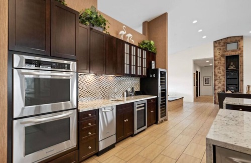 The kitchen will blow you away! This spacious, fully equipped space with two massive islands feels like your personal high-end restaurant kitchen. Even the most demanding of chefs would enjoy preparing delicious meals using numerous modern appliances.