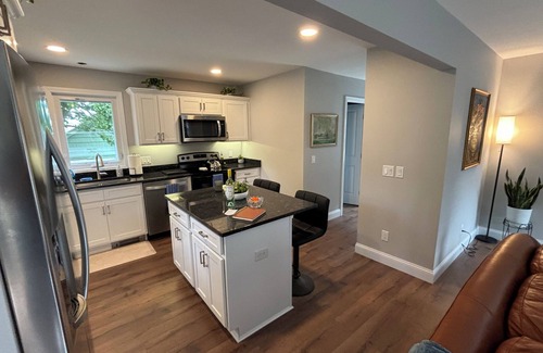 Come in and kick off your shoes. You’ll enter the cleanest 1000 sq ft cape through a self check in lock on a quiet neighborhood cul-de-sac. First floor is welcoming with a visually beautiful living room and kitchen, perfect for gathering, cooking, playing games or catching a late night movie on your 65” tv (with cable) cozying up on the comfortable Italian leather couch. Half bath with washer/dryer is also located on the first floor. Make your way upstairs, where you’ll find 2 bedrooms, one queen and one full. Upstairs bath has a tiled tub/shower. Outside, enjoy your South facing rear deck for warm sun all day long, or have a nice relaxing fire in the fire pit. Venturing out, you’ll be pleased how convenient it is visit all surrounding areas. This is a great place to stay for a quick ride to Harkness State Park, Rocky Neck State Park, Eugene O’Neill theater, Waterford Beach, Ocean Beach, Hole in the Wall Beach, McCooks Beach, Crescent Beach, Cini Beach, Pleasure Beach, Soundview Beach, Rhode Island beaches, Mohegan Sun and Foxwoods casinos, Supercharged Indoor Karting, Dinosaur Place, Great Wolf indoor water park. Take a day trip to Newport or catch the high speed ferry for a day at Block island. Go on a hike with plenty of trails close by. Beach essentials are here for you, beach chairs, umbrella, towels, cooler, sand toys, etc… Everything you need for a day at the beach or day of exploring is on site. We’ve got you covered. Plenty of shopping options in all directions. Iron, ironing board, blow dryer, etc.. is all here plus stuff you might’ve forgotten. It’s a great location to see/explore our entire, beautiful shoreline. You can get anywhere from here. You can!!! And a continental breakfast (or late night snack) of Eggo’s are always on hand. Snacks and an emergency meal are always available too.