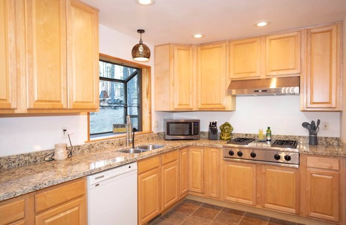The main floor has The Duke's room with a comfortable king bed, abathroom with a shower,thewell appointed chef'skitchen including a 36-inch gas range-top, double ovens, combinationconvection oven/air fryer/microwave and dishwasher, a coffee bar,a big round table for gathering, a two-story stonewood burning fireplace and a living space with a smart tv, sofa, and rocker recliner.