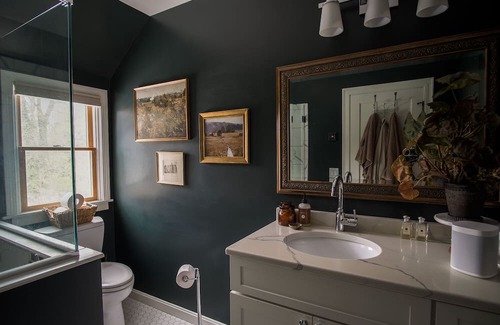 Upstairs, you'll find three bedrooms and a reading nook. The master bedroom has a queen-size canopy bed and 180 degree views of the surrounding trees and nature - waking up to birds singing in the spring and summer is a dream. The second bedroom overlooks the back yard, while the third bedroom overlooks the front yard. For larger parties, beds are available and will be placed in the office and living room. If you have a specific idea of how you'd like the sleeping arrangements to be set up, we're open to suggestions and we're happy to brainstorm together!