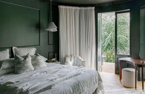 The master suite epitomises luxury, boasting a custom velvet king bed with a TV lift footboard at its centre. Floor-to-ceiling drapes envelop the space, while premium linens and indulgent Le Labo and Kevin Murphy amenities ensure a restful slumber. Step into the ensuite and immerse yourself in tranquillity as you soak in the large freestanding tub beneath the stars, framed by a custom skylight. A stylish walk-in robe adds to the suite's allure, offering discreet storage, while direct access to the gardens via a private deck offers enchanting views across the acreage.