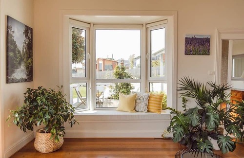 Once you step inside The Firs, the spacious living area features large windows that invite the sun in and and frame the panoramic views of the ocean. Whether you're curled up on the plush sofa with a book or enjoying a meal at the dining table, you'll have uninterrupted views of the Bass Strait.