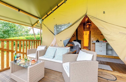 These three safari tents, nestled in the heart of North Yorkshire, offer a cosy escape with wood burner, private verandas and firepits.. 6 steps to entrance.