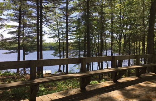 A great choice for two families or large groups to enjoy on Damariscotta Lake. The central kitchen /living/ dining areas are comfortably furnished, and feature beams and vaulted ceiling. The large screened porch greatly expands the living space and offers a lovely wooded view to the water. The waterfront features a gradually sloping gravel bottom and dock/float, making it well suited for swimming or boating. NOTE: There are two steep ladders required to climb to access each loft area.