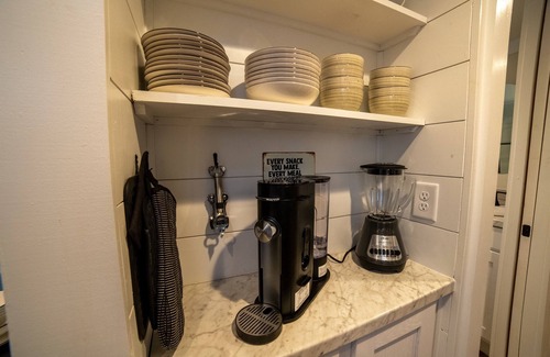 Escape to The Getaway, a thoughtfully designed tiny home nestled in the quiet charm of Deer Lick Falls. Relax on the covered deck with your morning brew or soak in the oversized hot tub surrounded by serene landscaping. Inside, leather seating, a goat-skin reading chair by the fireplace, and expansive woodland views create the perfect cozy vibe.