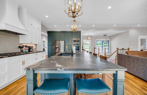 Open concept kitchen / dining / living room. Kitchen offers stainless steel appliances including two stoves, two dishwashers, and DRIP coffee makers! Our kitchen has 10' island with plenty of work space and seating for 8, which is open to our dining room with a table big enough to seat twelve. Or head outside where we offer a PROPANE GAS GRILL which we supply the propane!